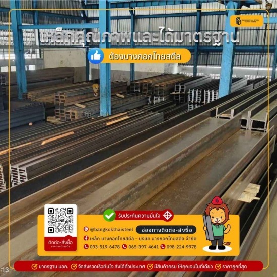 เหล็กไอบีมราคาส่ง ร้านขายส่งเหล็กบีมราคาส่งปทุมธานี มีเหล็กบีมทุกตัวมีทุกขนาด เหล็กเอชบีม ไอบีม ไวร์แฟรงค์ ราคาถูก H Beam, I Beam, Wide flange, C channel เหล็กไอบีม ( I Beam ) เหมาะสำหรับการนำไปใช้ทำรางเครนในโรงงานอุตสาหกรรม งานเครื่องจักร ทำเสา คาน งานโครงสร้างต่างๆ ที่ต้องรองรับน้ำหนักมากๆ เหล็กไอบีม ขนาด 150 x 75 x 5.5 x 9.5 มม. X 6 ม. น้ำหนัก 102.60 กก./เส้น เหล็กไอบีม ขนาด 200 x 100 x 7 x 10 มม. X 6 ม. น้ำหนัก 156.00 กก./เส้น เหล็กไอบีม ขนาด 250 x 125 x 7.5 x 12.5 มม. X 6 ม. น้ำหนัก 229.80 กก./เส้น เหล็กไอบีม ขนาด 250 x 125 x 10 x 19 มม. X 6 ม. น้ำหนัก 333.00 กก./เส้น เหล็กไอบีม ขนาด 200 x 150 x 9 x 16 มม. X 6 ม. น้ำหนัก 302.40 กก./เส้น เหล็กไอบีม ขนาด 300 x 150 x 8 x 13 มม. X 6 ม. น้ำหนัก 289.80 กก./เส้น เหล็กไอบีม ขนาด 300 x 150 x 10 x 18.5 มม. X 6 ม. น้ำหนัก 393.00 กก./เส้น เหล็กไอบีม ขนาด 350 x 150 x 9 x 15 มม. X 6 ม. น้ำหนัก 351.00 กก./เส้น เหล็กไอบีม ขนาด 400 x 150 x 10 x 18 มม. X 6 ม. น้ำหนัก 432.00 กก./เส้น ร้านขายเหล็กปทุมธานี-ลาดหลุมแก้ว ขายเหล็กเต็มเหล็กดีมี มอก. ราคาส่ง มีเหล็กครบทุกแบบ ครบทุกขนาด ขายเหล็กราคาถูก ราคาส่ง สต๊อกแน่น สั่งมากส่งฟรีถึงหน้างาน พื้นที่ กทม. ปทุมธานี อยุธยา นนทบุรี สมุทรปราการ พร้อมมีบริการจัดส่งสินค้าทั่วประเทศ บริษัท บางกอกไทยสตีล จำกัด ร้านขายเหล็กปทุมธานี-ลาดหลุมแก้ว ขายเหล็กเต็ม เหล็กดีมาตรฐาน มอก. ขายเหล็กราคาส่ง ขายส่งเหล็กก่อสร้าง เหล็กรูปพรรณ มีเหล็กครบทุกแบบ ขายราคาถูก  แผ่นเมทัลชีทคุณภาพ มีทุกสี ราคาส่ง สต๊อกแน่น สั่งมากส่งฟรี ส่งไวถึงหน้างานพื้นที่ กทม. ปทุมธานี อยุธยา นนทบุรี สมุทรปราการ พร้อมมีบริการจัดส่งสินค้าทั่วประเทศ ผู้ผลิต-จัดจำหน่ายเหล็ก และหลังคาเมทัลชีท มั่นใจได้ว่าสินค้ามีคุณภาพ มาตรฐาน มอก. สั่งซื้อสินค้า สอบถามสินค้าได้เลยไม่ต้องเกรงใจ ทีมงานพร้อมรับทุกสาย 0-2120-6273, 093-519-6478, 098-224-9978
